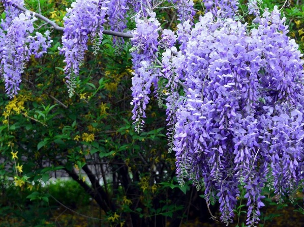 紫藤花是開花比較早的花卉,花穗很大開花很美,經常被用在公園做花廊花架。是很好的花園庭院裝飾花卉。紫藤花還能提煉芳香精油,有解毒,止吐,止瀉等功效,有很高的藥用價值。