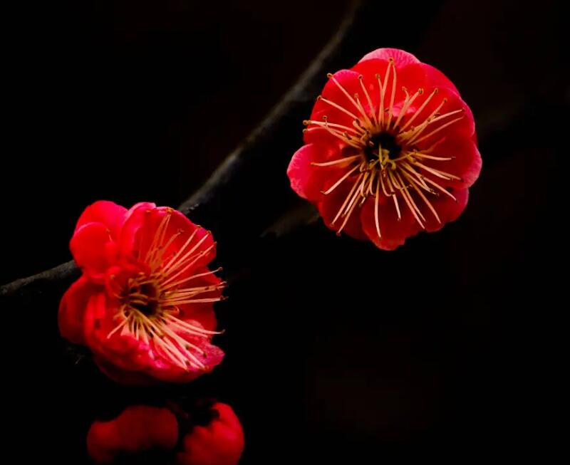 花朵顏色不同:臘梅和紅梅的花朵顏色是不一樣的。臘梅花朵的顏色比較單一,只有蠟黃色一種顏色,而紅梅的顏色品種就比較豐富,有紅色,粉色,白色等品種。
