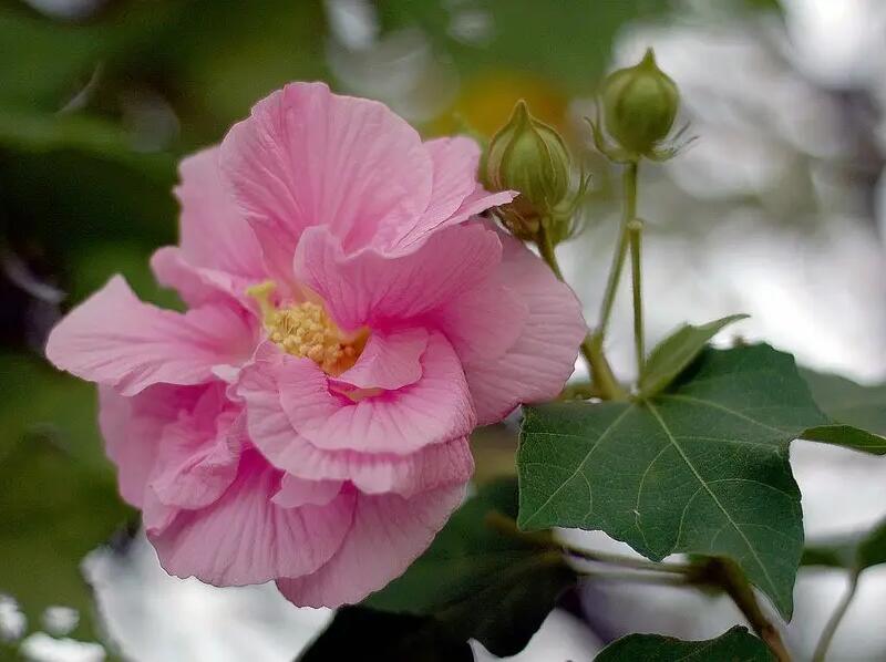 木槿牡丹屬于木本花卉,開粉紅色或者淡紫色的花朵,是重瓣的品種,屬于落葉灌木,高度大概3~4米左右。