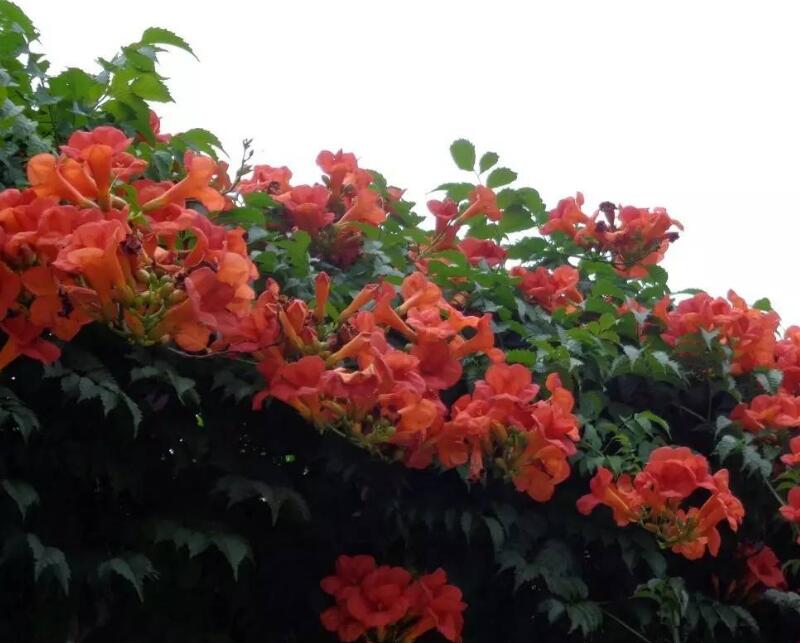 凌霄花不是木本也不是草本,它屬于藤本植物,木質化的枝條長有氣生根,喜歡附著在其他植物或者墻體上生長。